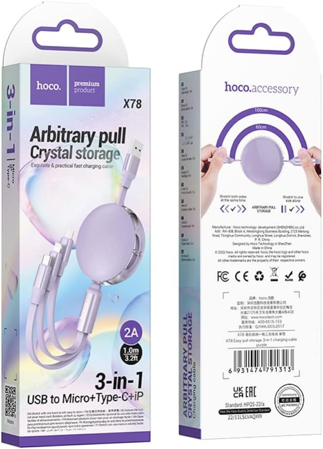 - Hoco X78 - Easy Pull Storage, 3-in-1 Super Charging Cable, USB-A To Lightning/USB-C/Micro-USB Plug Hoco X78 - Easy Pull Storage, 3-in-1 Super Charging Cable, USB-A To Lightning/USB-C/Micro-USB Plug